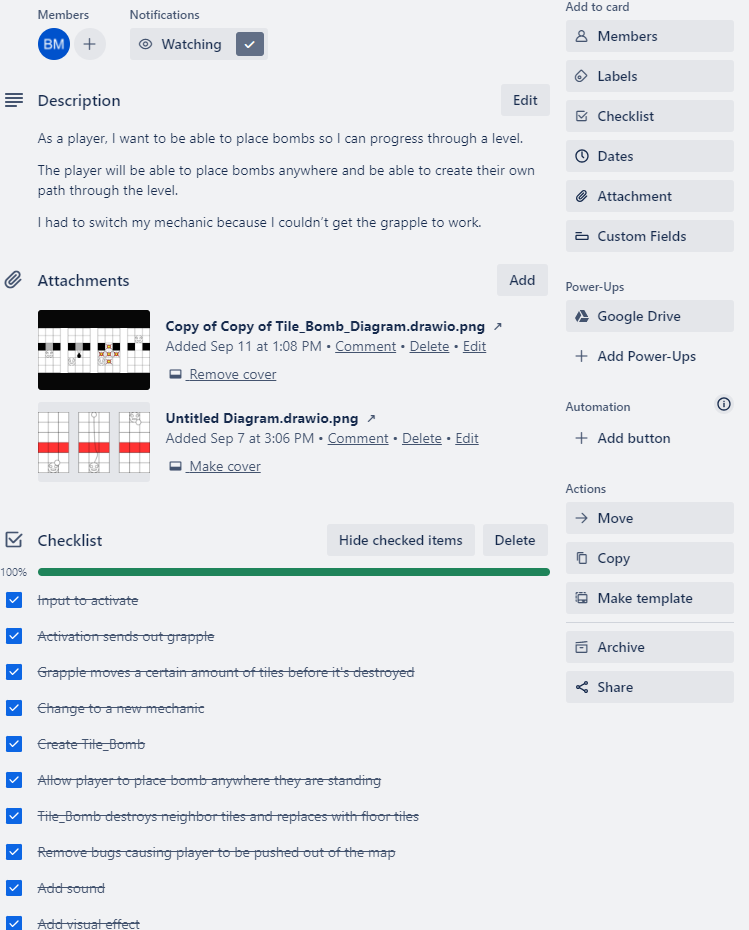 - Creating My Own Mechanic from Scratch: When I finally settled on my mechanic, I was able to implement it and have it perform its intended function. I was able to design a bomb tile that would occupy the player’s current tile. After a set amount of time it will explode, checking if any surrounding tiles can be destroyed. It would then destroy them.
